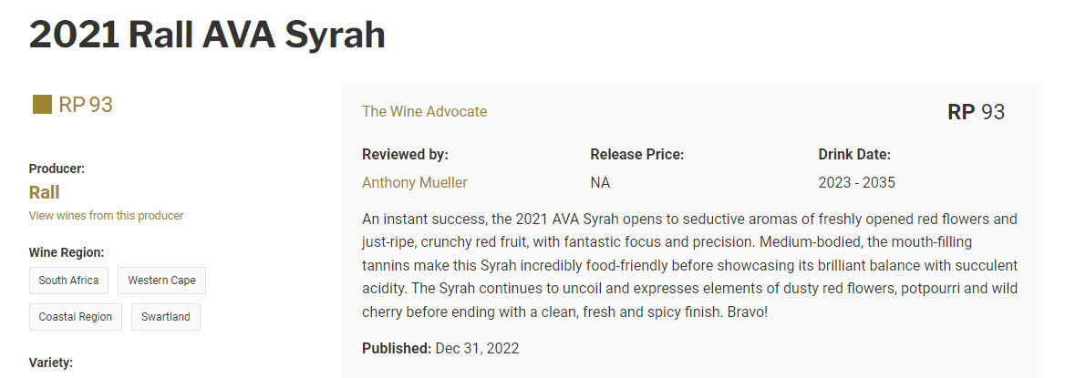 赤:[2021] エヴァ・シラー/ラール・ワインズ (南アフリカ/スワートランド)Ava Syrah/Rall Wines (Swartland/South Africa)
