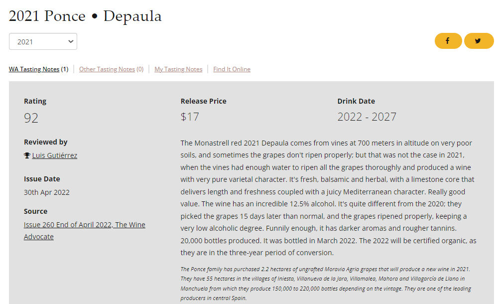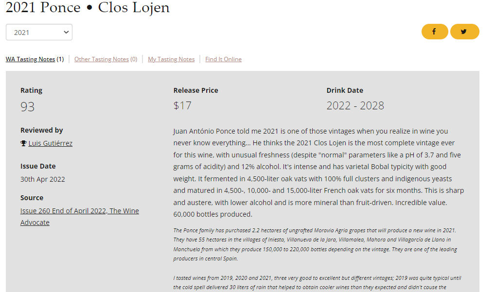 WA94点で、飲み頃~2025年。レビュワーはR.パーカー。
