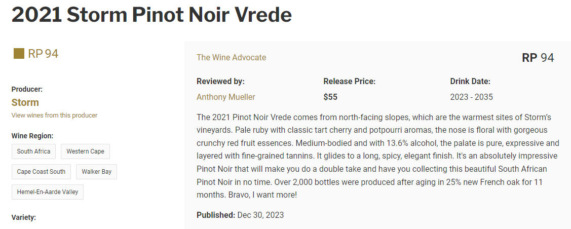 ストーム リッジ ピノ ノワール 2021 Storm Ridge Pinot Noir 赤ワイン 南アフリカ