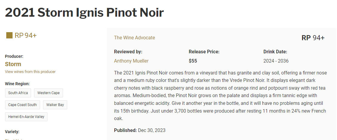ストーム イグニス ピノ ノワール 2021 Storm Ignis Pinot Noir 赤ワイン 南アフリカ