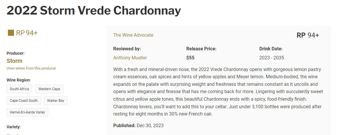 ストーム フレダ シャルドネ 2022 Storm Vrede Chardonnay 白ワイン 南アフリカ